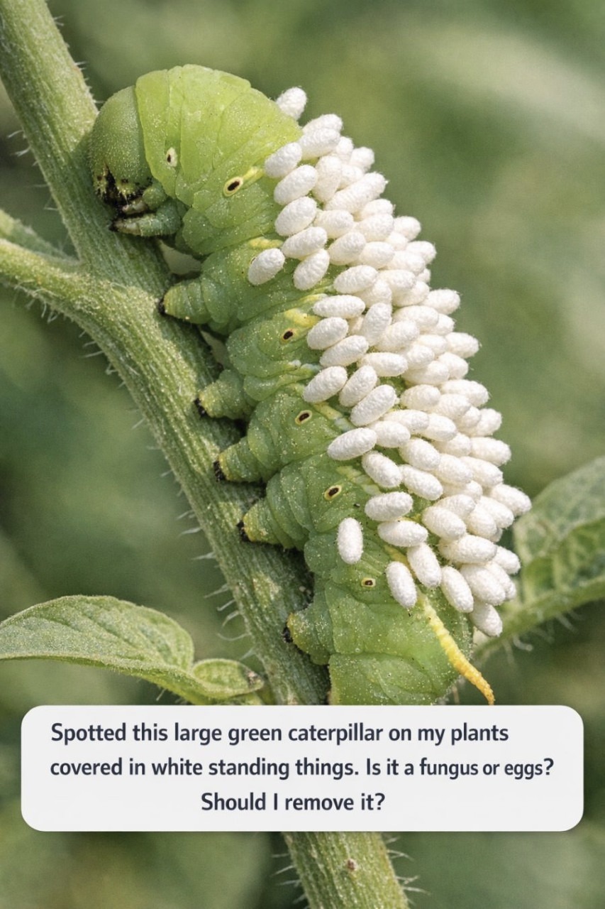 Spotted this large green caterpillar on my plants covered in white standing things. Is it a fungus or eggs? Should I remove it?